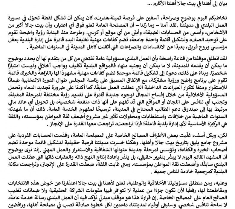 وقال حزب الشعب – منظمة الشهيد جريس قنقر في بيت جالا – اليوم الأربعاء، في بيان وصل (راديو بيت لحم 2000) نسخة منه، إنه قاطعَ الانتخابات بسبب ما وصفه بـِ “عدم توفّر مقومات الشراكة، وغياب ضمانات تحقيق المصلحة العامة” على حدّ تعبير البيان.