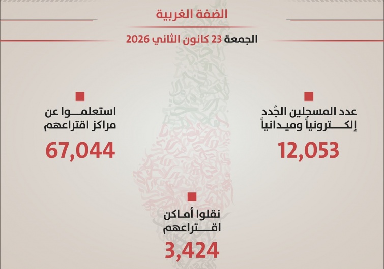 محلي لجنة الانتخابات: التسجيل في سجل الناخبين يغلق عند الساعة الثانية من بعد ظهر اليوم بيت لحم 2000 – أعلن الناطق باسم لجنة الانتخابات المركزية فريد طعم الله، اليوم السبت، تسجيل 12053 مسجلا جديدا في... 24 يناير, 2026 11:52 ص